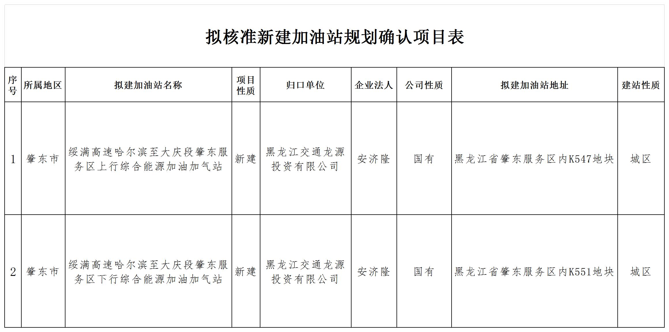 按照《绥化市成品油零售经营资格审批改革工作的实施意见》有关规定,绥化市商务局对肇东市申报的2个新建加油站规划确认材料进行了审核,经绥化市成品油经营资格审批改革联席会议办公室研究,拟核准肇东市呈报的新建加油站规划确认项目申请。