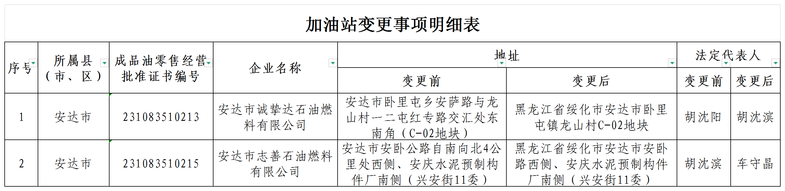 安达市诚挚达石油燃料有限公司、安达市志善石油燃料有限公司申请变更法定代表人、地址材料齐全,符合变更要求,现对变更事项进行网上公示。公示期为5个工作日(2026年1月27日—2026年2月2日)。