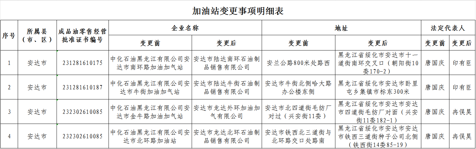中化石油黑龙江有限公司安达市南环路加油加气站、中化石油黑龙江有限公司安达市牛街加油加气站、中化石油黑龙江有限公司安达市金牛路加油加气站、中化石油黑龙江有限公司安达市北环路加油站申请变更企业名称、法定代表人、地址材料齐全,符合变更要求,现对变更事项进行网上公示。公示期为5个工作日(2026年2月9日-2026年2月13日)。