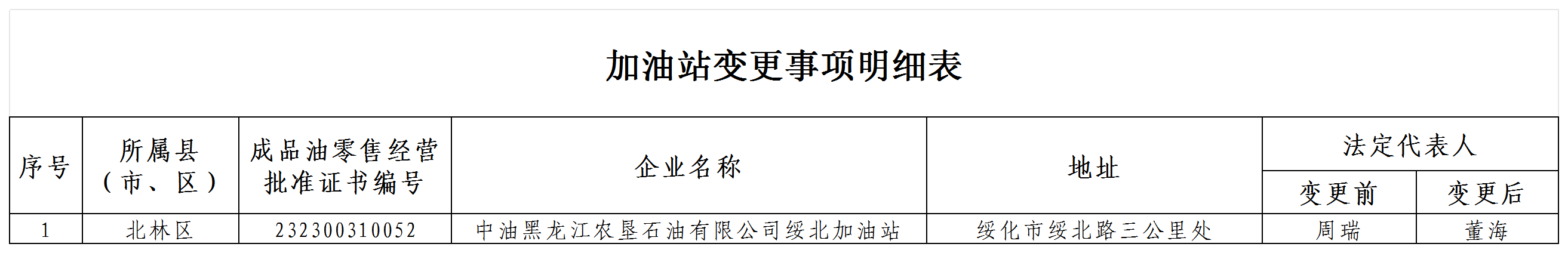 中油黑龙江农垦石油有限公司绥北加油站申请变更法定代表人材料齐全,符合变更要求,现对变更事项进行网上公示。公示期为5个工作日(2026年2月11日-2026年2月15日)。