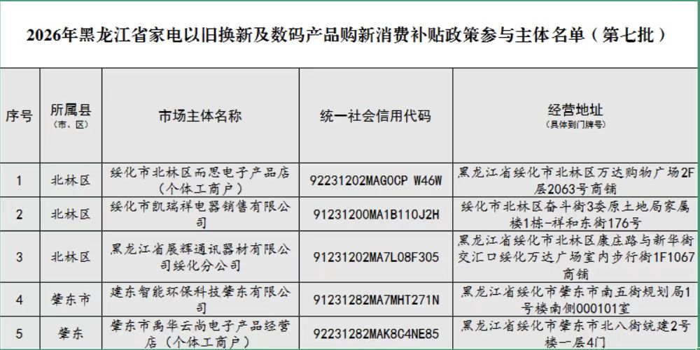 附件:2026年黑龙江省家电以旧换新及数码产品购新消费补贴政策参与主体名单(第七批)