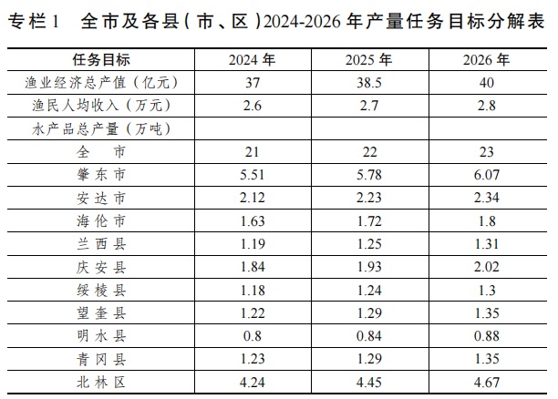 到2026年,全市冷水渔业经济发展优势和潜力得到明显释放,渔业生产组织化、规模化和社会化程度不断提高,水产养殖业绿色发展水平得到进一步提升,渔业一二三产融合协调发展取得长足进展,建设冷水鱼产业强市。全市水产养殖面积稳定在110万亩(池塘58万亩、水库51万亩、湖泊6万亩)以上,发展稻渔综合种养面积13万亩以上,名特优养殖30万亩以上(柳根3万亩以上,河蟹20万亩以上,小龙虾1300亩以上),水产品总产量达到23万吨以上,渔业经济总产值实现40亿元以上,年均增长率5%左右,打造绥化“双基地”,即:全省最大的水产品养殖基地和全省最大的苗种供应基地。