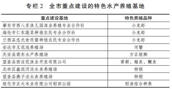 3.培育特色品种养殖。大力引进发展方正银鲫、柳根、河蟹、小龙虾、鳜鱼等优势特色品种,不断丰富全市名特优养殖品类。充分利用池塘、大水面、稻田资源优势、实现小龙虾等特色养殖品种“南繁北育”,联合黑龙江省水产研究所、黑龙江省技术推广总站、东北农业大学“黑龙江寒地小龙虾产业发展研究中心”,依托科研机构的科技支撑,在特色品种养殖模式、繁育体系、品质评价、饲料及动保产品、人才联合培养、科研成果转化等方面获得更大提升。(牵头单位:市农业农村局;责任单位:市自然资源局、市生态环境局、市水务局、市财政局、市科技局,各县(市、区)人民政府按职责分工负责)