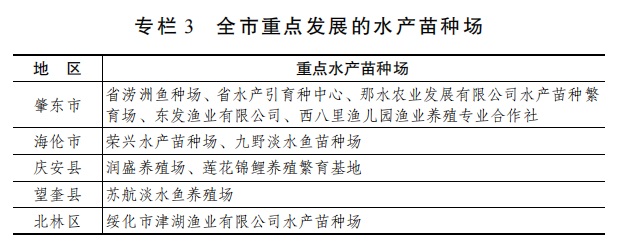 2.打造全省最大苗种繁育基地。充分发挥苗种产业优势,以渔业一产为基础,根据市场导向依托科技手段,在繁育常规品种基础上,扩大名特优品种占比,发展苗种场户提档升级,创建升级省级水产良种场,构建水产苗种产业中心,打造以肇东市为核心的全省最大苗种繁育供应基地。加大繁育鲤、草、鲢、鳙、鲫、鳜鱼、雅罗鱼、黄颡鱼、鳊鱼、柳根、鲶鱼、大白鱼等优质品种苗种产孵能力,与中国水产研究院黑龙江省水产研究所、省水产技术推广总站水产引育种中心、黑龙江省农业工程职业学院合作,打造以肇东市为主的名特优冷水鱼种质资源库,实现种业“育繁推”一体化发展新格局。全市保证各类苗种年繁育能力25亿尾以上。(牵头单位:市农业农村局;责任单位:市自然资源局、市生态环境局、市水务局、市财政局、市市场监督管理局,各县(市、区)人民政府按职责分工负责)