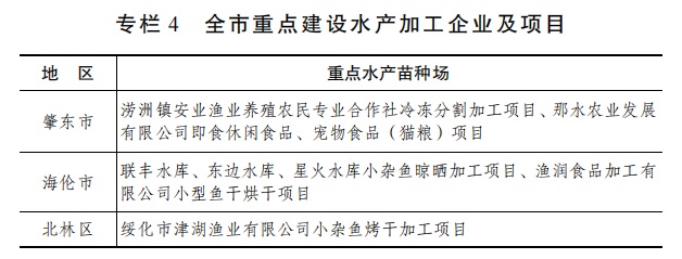 5.大力发展水产品加工。加大招商引资力度,积极引进冷水鱼加工项目,发展一批产业关联度大、技术装备水平高、生产竞争力强的水产加工企业,延长产业链条,加快产业化进程。积极发展大宗鲜活水产品保鲜加工和综合利用,推进水产品向分割产品、休闲食品、预制菜等初、精深加工方向发展。(牵头单位:市农业农村局;责任单位:市工信局、市商务局、市自然资源局、市生态环境局、市水务局、市财政局、市市场监督管理局,各县(市、区)人民政府按职责分工负责)