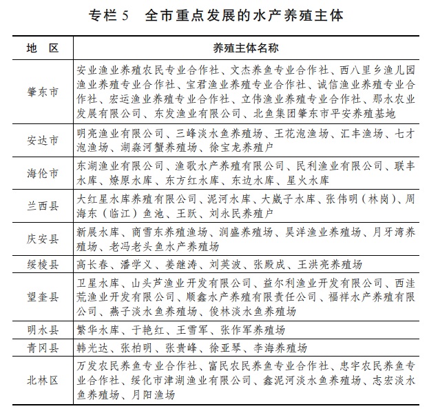 9.推动现代渔业科技创新。积极发展智慧渔业,加快物联网、卫星通讯、人工智能等现代信息技术在渔业生产、经营、加工各领域的应用。推广水质在线监测、智能增氧、精准饲喂、病害防控、循环水智能处理等技术应用,逐步构建覆盖渔业生产和管理的智慧渔业技术体系,实现渔业经营主体决策信息化、生产智能化、物流销售数字化、管理科学化。完善淡水鱼产业技术协同创新推广体系,引导和鼓励科研院所、技术推广机构、大专院校、与知名企业共建研发平台和专业人才培养。到2026年,着力打造肇东市那水农业发展有限公司黄颡鱼水产种质资源场、肇东市西八里渔儿园渔业养殖专业合作社、绥化市津湖渔业有限公司3个智慧渔场。(牵头单位:市农业农村局;责任单位:市科技局、市自然资源局、市生态环境局、市水务局、市财政局、市市场监督管理局,各县(市、区)人民政府按职责分工负责)