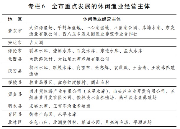 7.大力发展生态休闲渔业。充分发挥全市旅游资源和冰雪资源优势,通过水上娱乐、水下捕鱼、园区采摘、冬捕、增殖放流等主题活动,把民俗文化、渔猎文化等元素融入休闲渔业发展全过程,丰富休闲渔业和冰雪渔业活动内涵。发展以“冬捕”“冬钓”为主要内容的冰雪风光游,积极探索 “文旅+休闲渔业+冰雪”模式,不断壮大休闲渔业品牌经济。到2026年,发展全市休闲渔业总面积13万亩以上,规模以上经营主体38个以上。(牵头单位:市农业农村局;责任单位:市文化和旅游局、市商务局、市水务局、市财政局、市市场监督管理局,市发改委,各县(市、区)人民政府按职责分工负责)