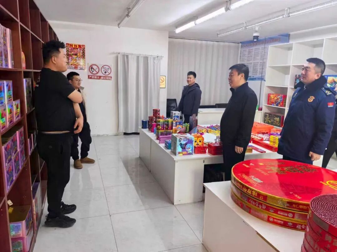 在好哥们烟花爆竹常年零售店,张铁峰仔细检查产品质量、储存条件及安全警示标识设置情况,重点了解烟花爆竹运输、储存、销售等环节安全管控措施。