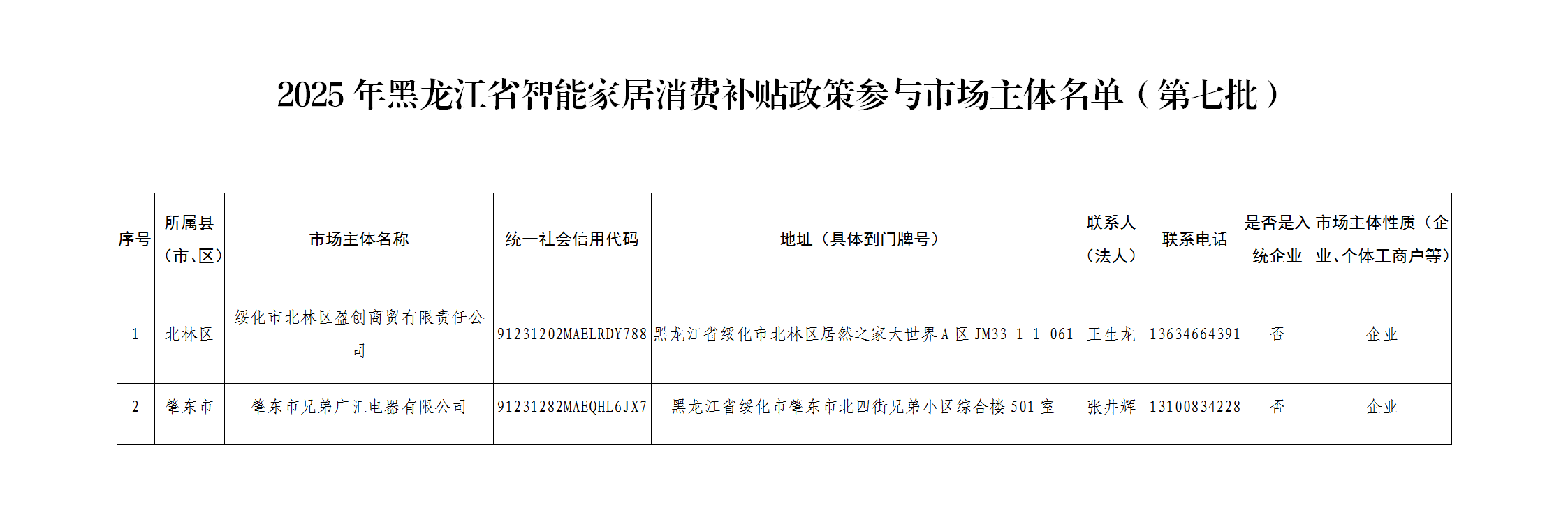 附件:2025年黑龙江省智能家居消费补贴政策参与企业名单(第七批)